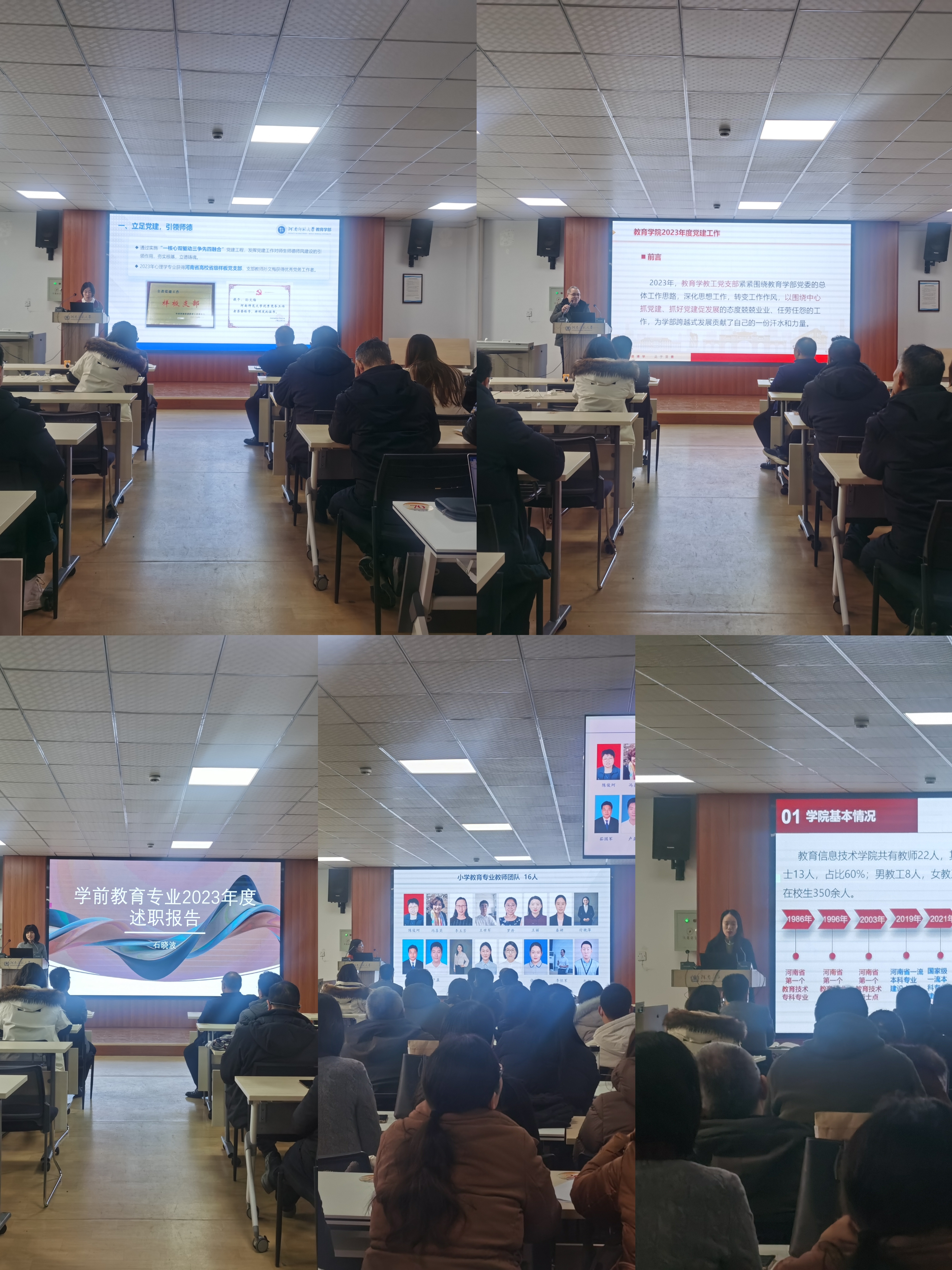 会上,学部副处级领导结合各自分管工作全面总结了2023年工作,提出存在的问题,并就2024年重点任务进行了汇报。随后,心理学院、教育学院、学前教育、小学教育、教育信息技术学院等5名学院(专业)负责人作为科级干部代表分别就2023年度工作开展情况、学院特色和创新工作、存在的主要问题和2024年工作思路向全体教职工进行现场述职,其他科级干部进行书面述职。在认真听取科级干部述职的基础上,全体参会人员结合平时了解,本着实事求是、客观公正的态度,对科级干部进行了民主测评。