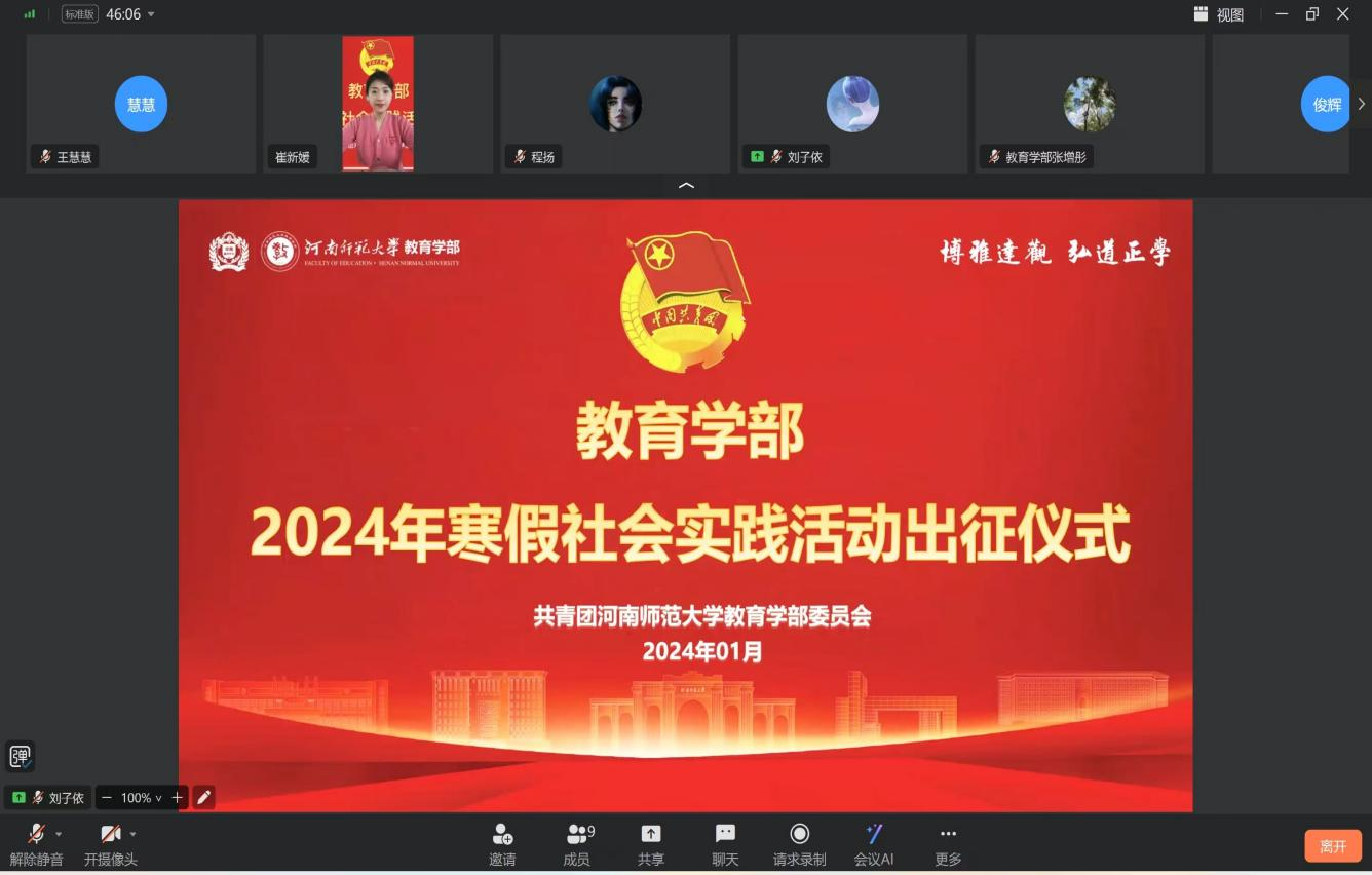 1月19日上午,教育学部在线上召开2024年寒假社会实践活动出征仪式暨安全培训会。学部团委副书记崔新媛,相关年级辅导员、学生干部及社会实践全体团队成员参加此次会议。
