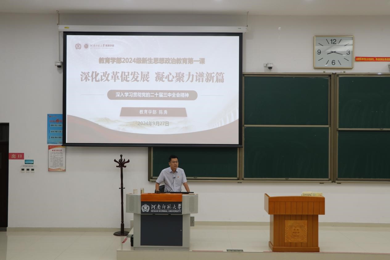 为深入学习贯彻党的二十届三中全会精神,9月27日晚,教育学部在文昌楼302教室开展秋季开学思政第一课,学部全体政工干部和学生代表近400人参加。学部党委书记陈勇担任主讲。