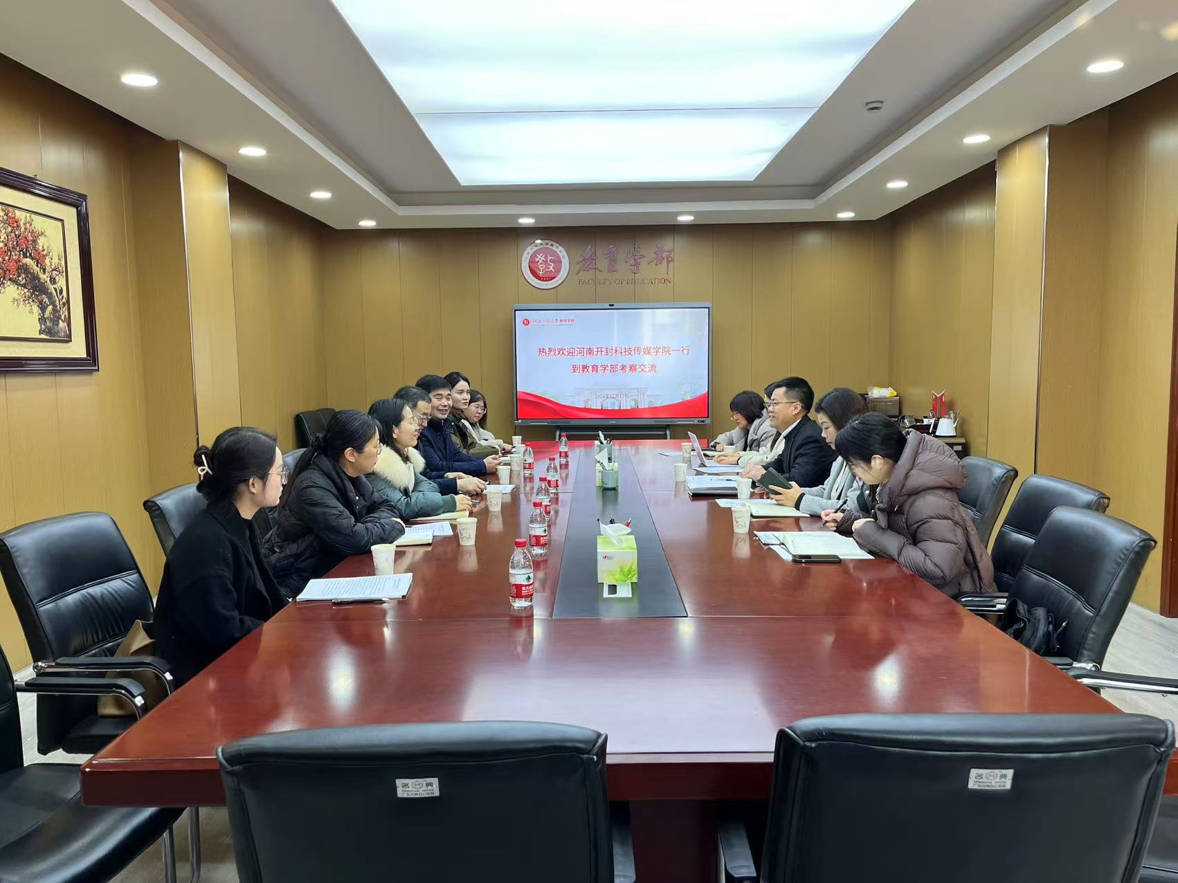 12月17日上午,河南开封科技传媒学院学生工作部、人文学院一行7人到教育学部考察交流,座谈会在田家炳教育书院801会议室举行。教育学部党委书记陈勇、党委副书记康淑霞、副部长卜彩丽、心理学和学前教育专业负责人参加会议。
