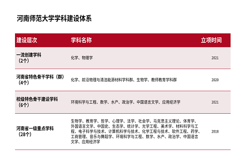 2016年12月,启动实施“河南师范大学优势特色学科建设工程”。经学科申报、专家评审、学科答辩、学校研究审议,分理工科、文科两个类别立项建设8个校级优势特色培育学科:环境科学与工程、生物学、政治学、中国语言文学(A类);统计学、智能制造与光电控制工程学科群、马克思主义理论、区域经济与创新发展学科群(B类)。经过三年多的建设,8个校级优势特色学科多项核心指标呈现快速增长态势,在高层次队伍建设、高水平科研成果、高质量社会贡献等方面均取得显著成效,成为支撑学校学科建设高质量发展的核心力量。