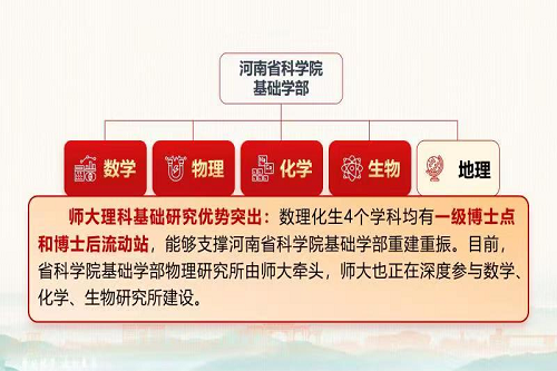 深度融入省科学院重建重振。促进省科学院基础学部与我校数理化生四个基础学科一体建设、融合发展,为省科学院重建重振贡献师大力量;从而实现管理体制、人才团队、资源配置、成果孵化等一体化,达到互利共赢、优势互补、共建共享的效果。
