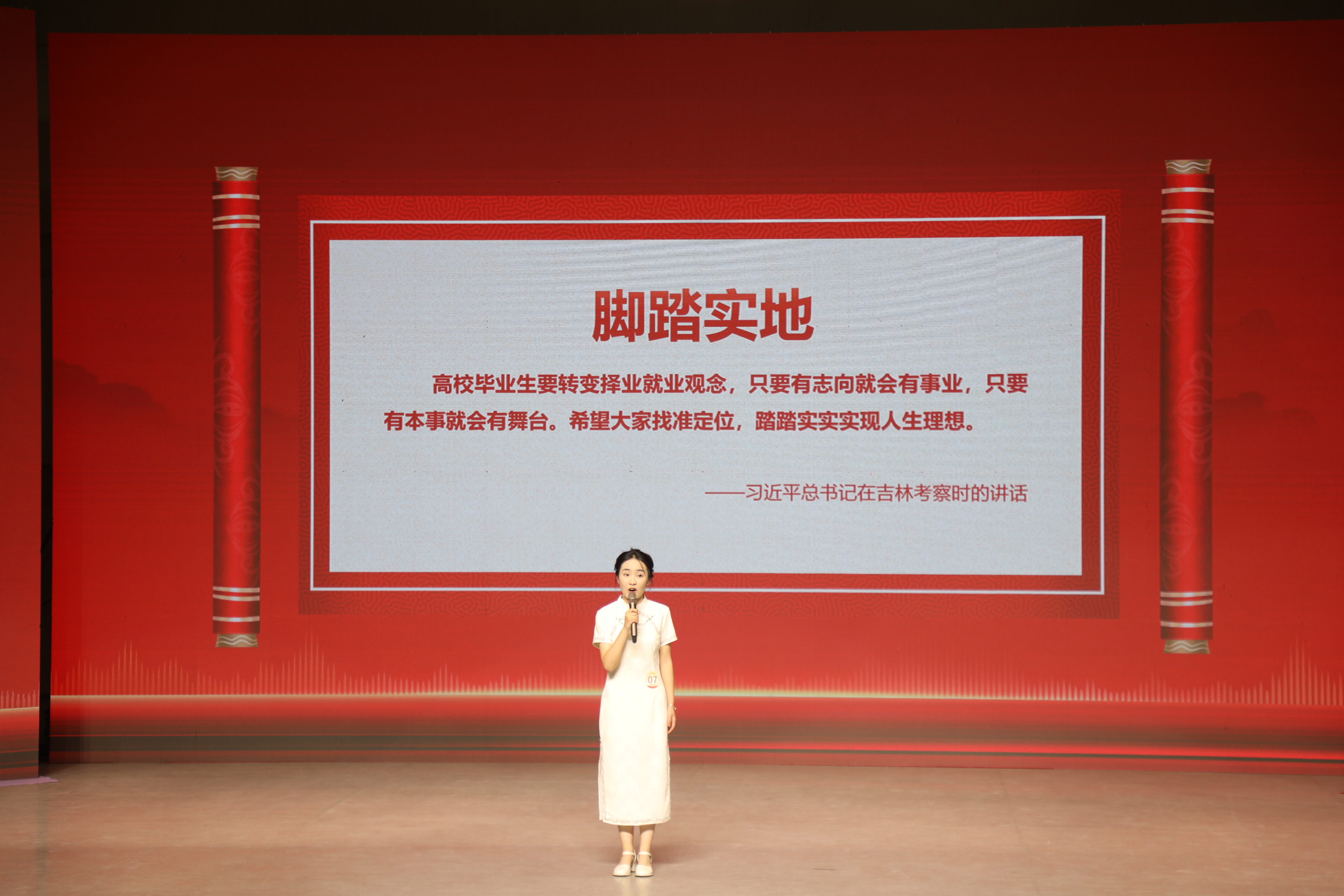 普通话组决赛现场,参赛选手以习近平总书记对新时代青年的殷殷寄语为主线,围绕“巍巍华夏·矢志不渝复兴梦”“百年师大·初心如磐育良才”“时代青年·使命在肩勇担当”三个篇章进行“主题演讲”,从自信自强、志存高远、脚踏实地、挺膺担当四个篇章展开“即兴演讲”。评委代表文学院教师刘志芳从演讲内容、演讲技巧以及演讲效果等角度进行专业点评。