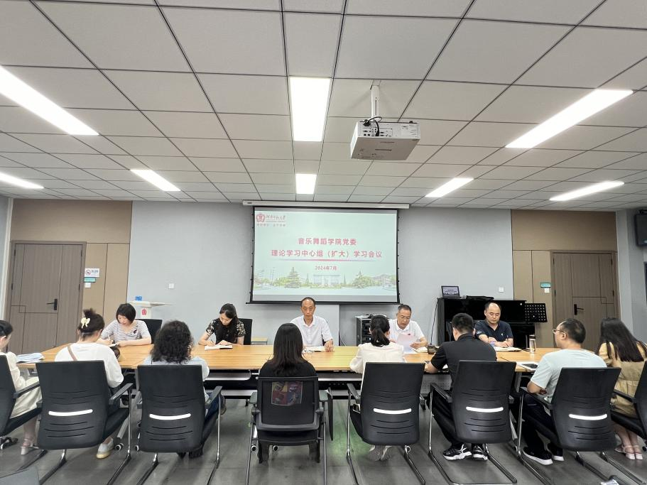 7月23日上午,音乐舞蹈学院在学院二楼会议室召开党委理论学习中心组(扩大)学习会,专题学习党的二十届三中全会精神。学院党委委员、各党支部书记及科级干部参加。会议由学院党委书记万运京主持。