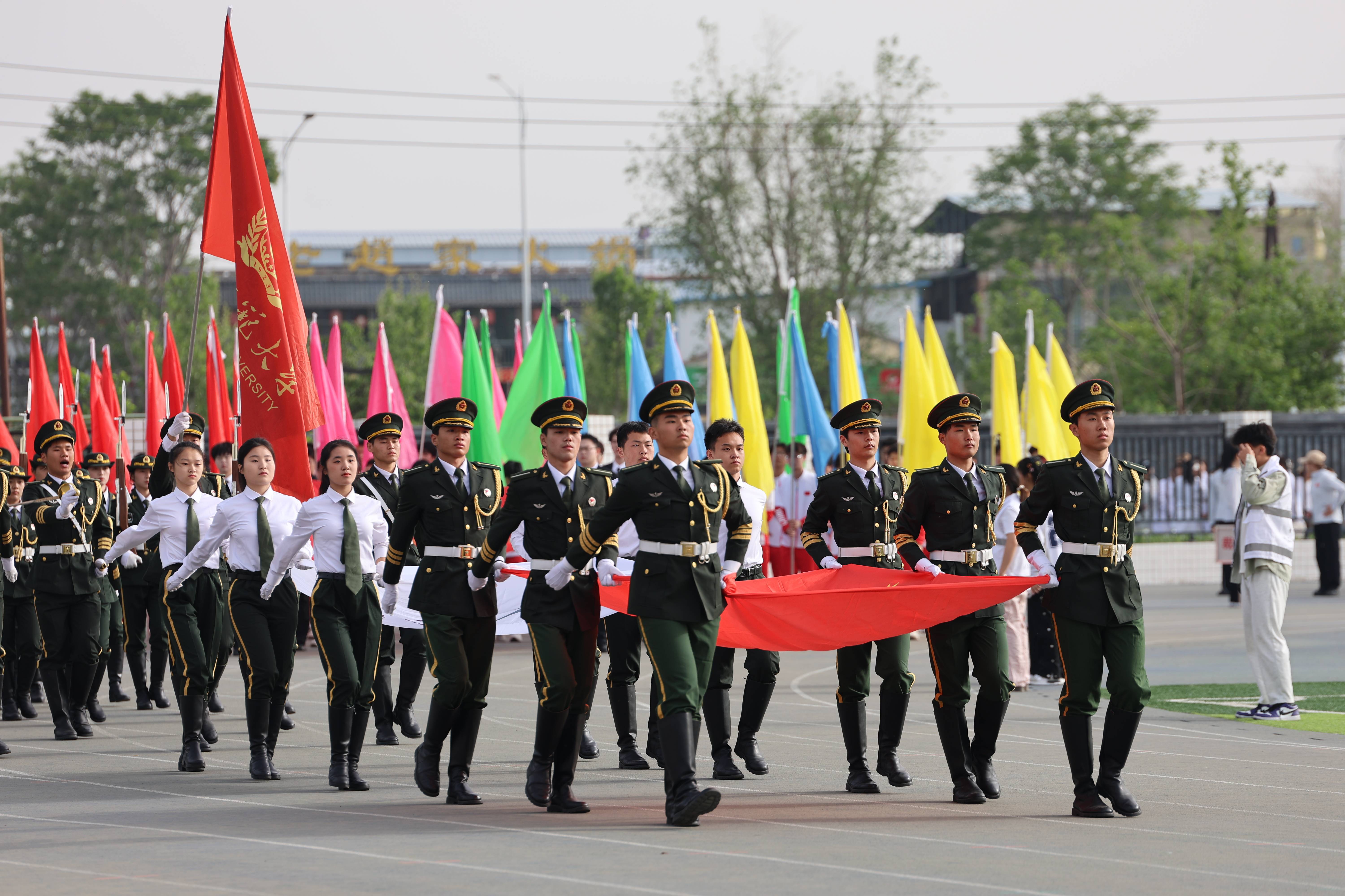 运动场上,国旗护卫队、彩旗方阵、裁判员方阵和各学院(部)运动员方阵步伐矫健、口号响亮,依次通过主席台。五星红旗在庄严的国歌声中冉冉升起,校旗和运动会会旗伴着校歌依次升起。