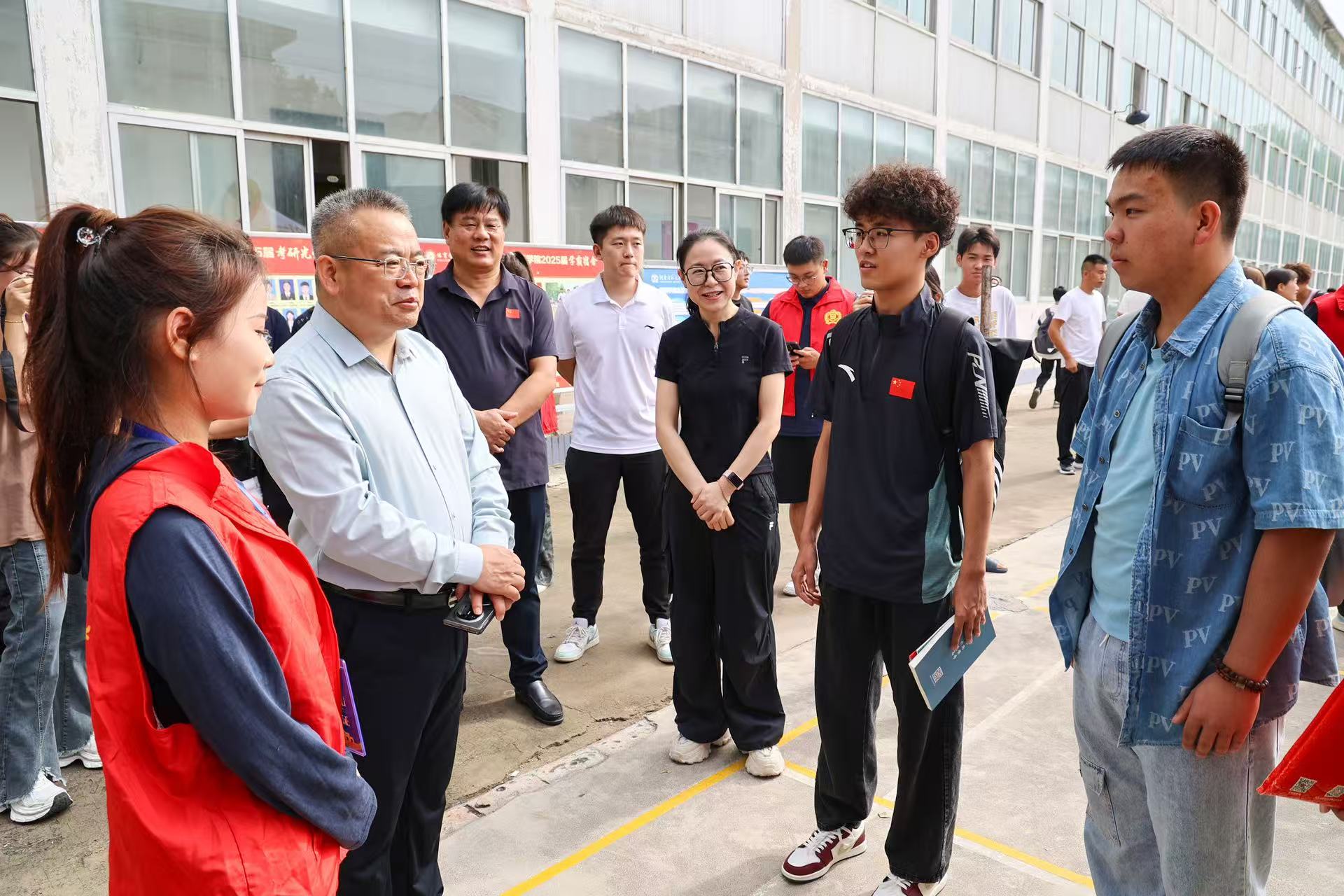 在本部东校区迎新点,校长郭海明一行查看了各学院迎新摊位设置情况,询问了报到流程和新生报到进度,慰问了现场工作人员和学生志愿者。郭海明对各学院(部)结合专业特色,精心设计迎新活动表示赞赏。他指出,迎新既是对学校组织协调能力的考验,也是展现师大校风学风、人文关怀的重要窗口。要将育人理念贯穿迎新的全过程,通过多样化的迎新设计,展示学校办学成果,培养感恩意识,传递价值导向,让新生从入学之初就感受到学校的育人初心,为后续成长奠定基础。