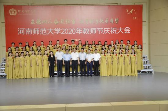 由音乐舞蹈学院吴俊廷老师领唱的《好大一棵树》,歌颂了教师这一平凡而又特殊的群体,合唱团的伴唱,丰富了歌曲的感染力。“不忘初心,继续前进,啊……”由52名女生唱出的清纯靓丽的声音飘进音乐厅,经过艺术加工处理的《不忘初心》或娓娓道来,或群情缴昂,每一句歌词都感染着在场的所有观众,结束句“万水千山最美中国道路”,更是将大会推向了高潮。演出在全体人员合唱的《河南师范大学校歌》中圆满落幕。