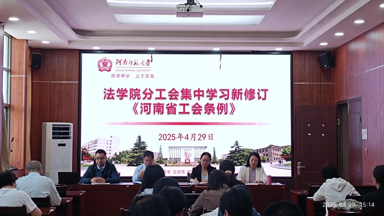 为宣传贯彻新修订的《河南省工会条例》,提升学院工会干部依法履职能力,4月29 日下午,法学院分工会于崇法楼301会议室组织开展《河南省工会条例》专题学习活动。学院领导出席会议,各工会委员、小组长与成员积极参与。会议由学院分工会主席、副院长史春花主持。
