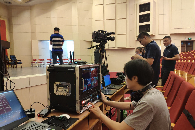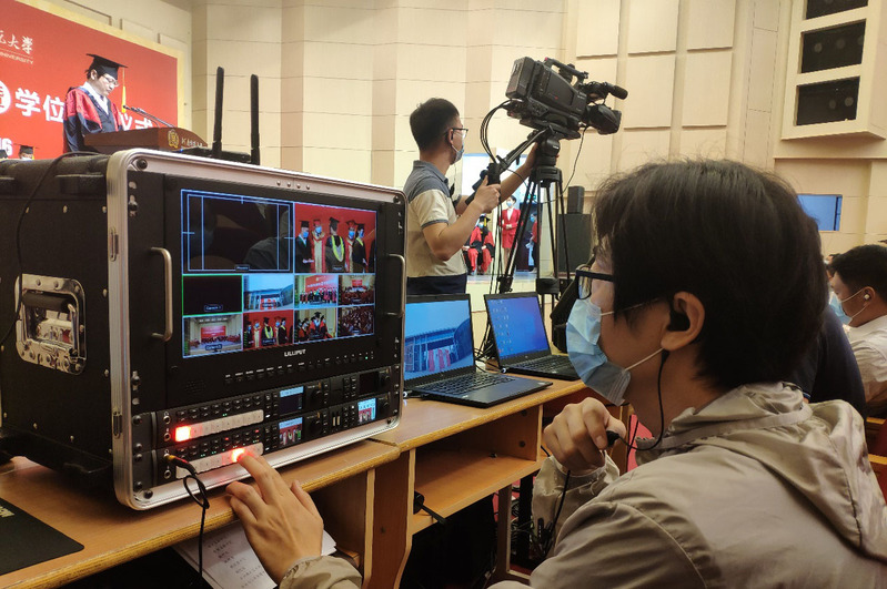 本次毕业典礼的视频技术和网络直播由中心负责。为确保直播的顺利进行,中心自接到任务后,及时召开直播工作动员会,研究制定毕业典礼网络直播方案,部署落实具体工作,做到专岗专人负责,并成立了工作小组。网络平台对接组提前与多家直播平台联络、协商,并最终确定中国移动、中国电信、哔哩哔哩3家作为本次毕业典礼的直播平台。摄像组和摄像保障组提前两天就进入会场,进行直播设备安装、网络布线、布设摄像机位以及多次网络直播测试等准备工作。经过组织统筹、平台选择、摄录准备、测试优化等一系列细致工作,整个直播过程图像清晰、流畅,得到了师生们的认可和好评。