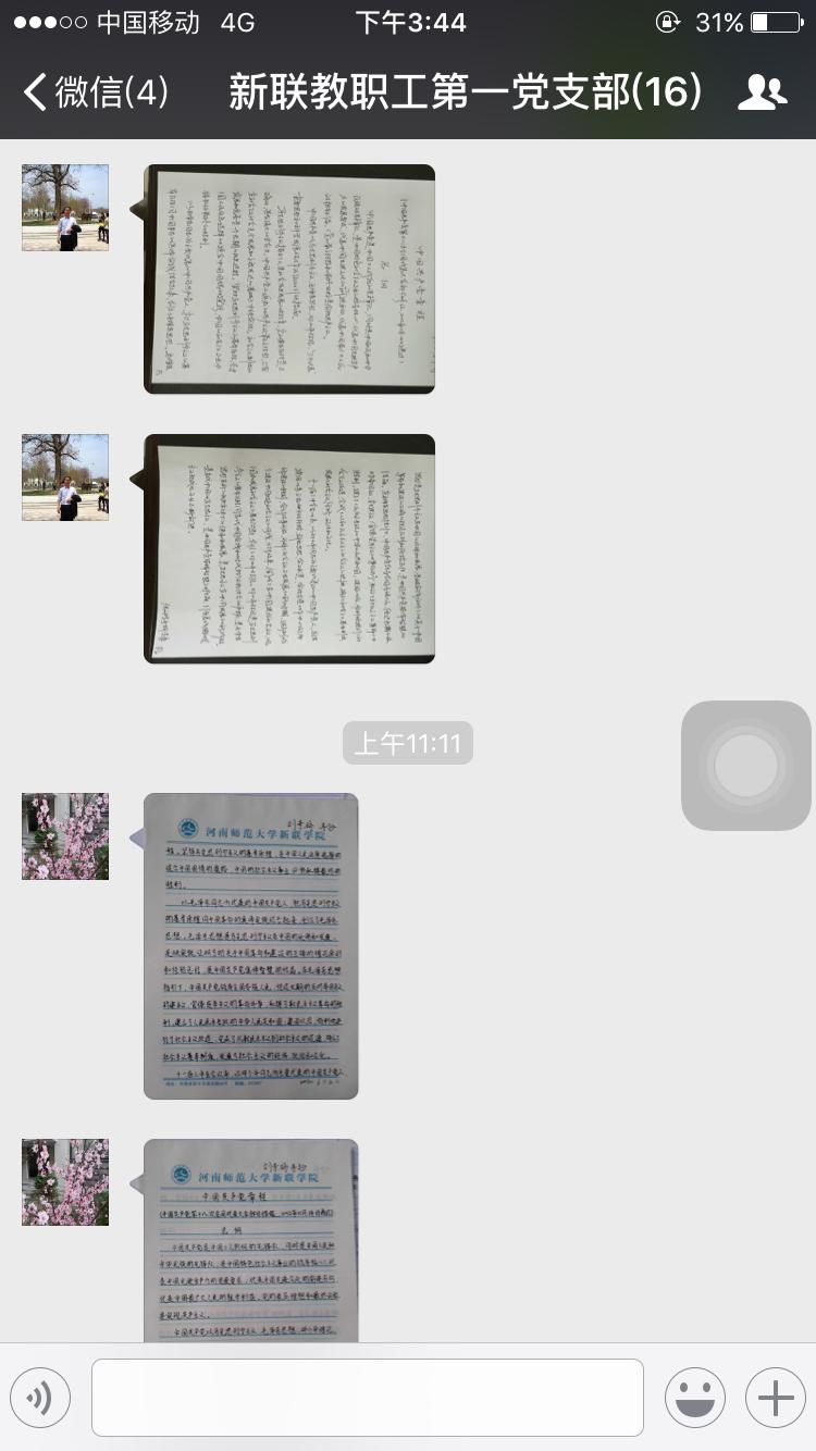 新联学院党委书记张永胜及其他支部成员微信晒手抄党章截图