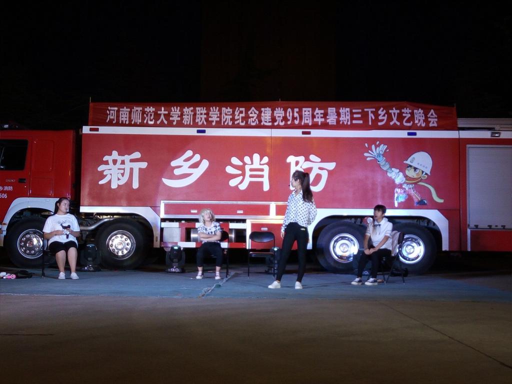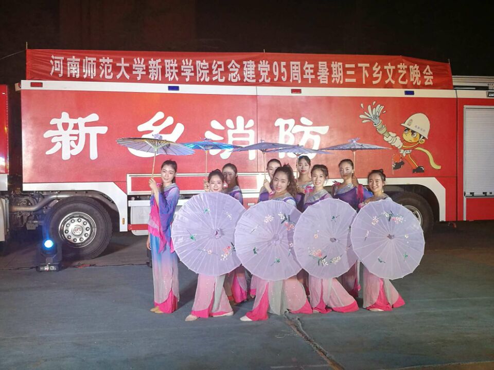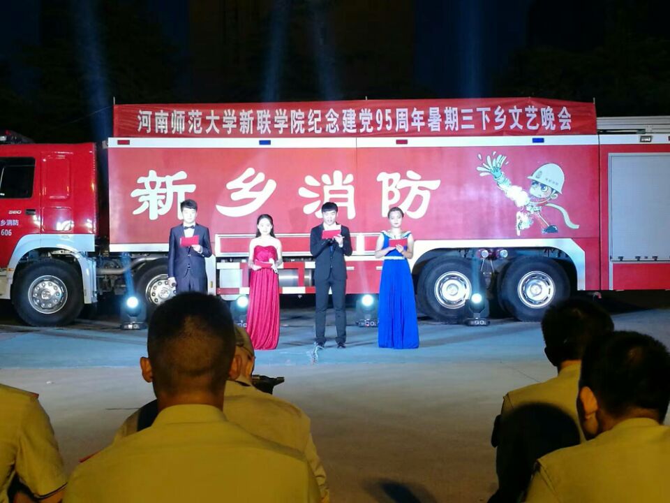 7月15日,新联学院大学生暑期“三下乡”文化艺术服务团,在新乡市高新区消防大队,举办了庆祝建党95周年暨慰问抗洪救灾消防官兵文艺演出。新联学院党委副书记李浩、团委书记王潭、管理办公室副主任孔艺,高新区消防大队教导员朱海洋、大队长张明,河南电视台大象网新乡运营总监崔新保等出席。文化艺术服务团指导老师宋洋、乔玥、吕净、尹霏、赵明、申环、刘刚以及高新区消防大队所有消防官兵近百人共同观看了演出。河南电视台、新乡电视台、新乡教育电视台、大象网、大河网、搜狐网、网易网、精彩河南网等众多媒体进行现场报道。