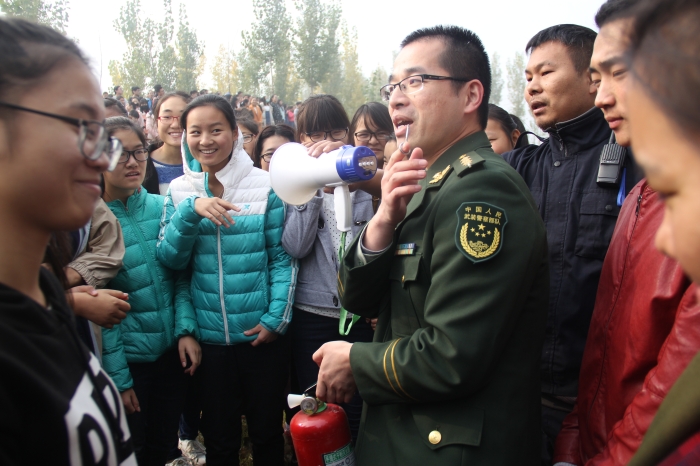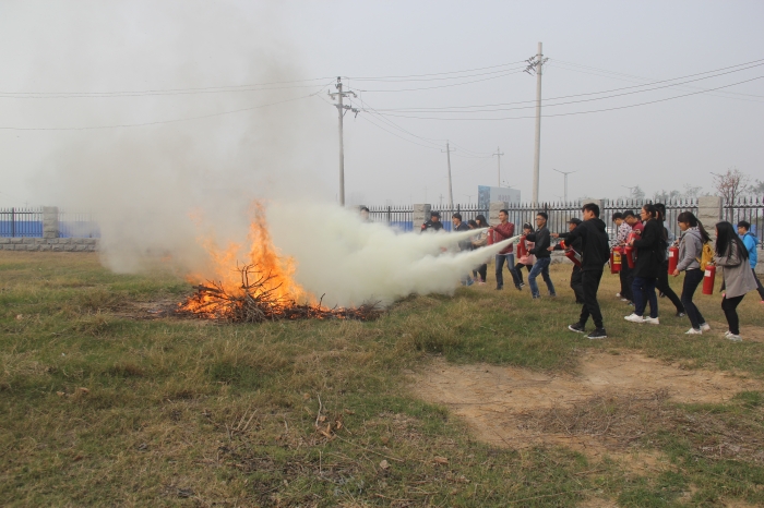 灭火演练中,在消防官兵的指导下,学生、辅导员和后勤员工使用灭火器练习了实地灭火。