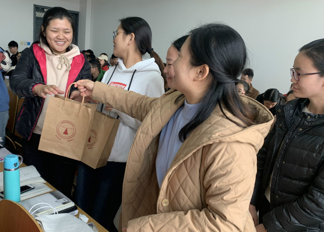 活动伊始,李敏就近几年来数学与计算机科学学院的考研情况做了细致分析。数计学院近三年考研率逐年呈稳步上升态势,在全国硕士研究生考试报名人数持续增长的大环境下,考研学子仍然取得了不俗的成绩。李敏向同学们表示,学院永远是大家的坚强后盾,学院会尽一切力量做好考前服务,全力帮助考研学子解决困难,鼓励大家安心备考。毕业班辅导员孔德宇结合自身的求学和科研经历,鼓励同学们放平心态、积极备考、咬紧牙关、冲刺到底。随后,与会老师为考研学子发放“金榜题名”考研福袋。毕业班辅导员李偲玮向同学们讲述了考研福袋的美好寓意及制作过程,每一个细节都透露出对同学们考研之路艰辛的理解,鼓励他们在最后阶段迎难而上,创造学院的新辉煌。同学们收到心意满满的福袋,感动之余更是充满动力,纷纷表示一定将考研进行到底,努力取得优异成绩,不辜负自己的理想,不辜负老师的关心,不辜负家长的支持,打赢考研这场硬战。