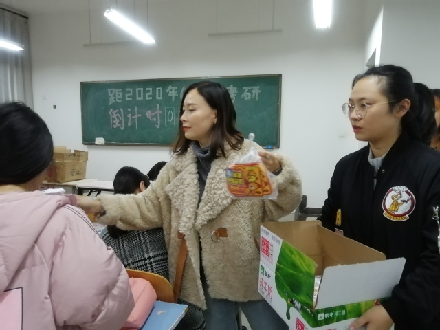 慰问活动中,孔艺老师肯定了考研学子一年来的辛苦付出,鼓励同学们要充满理想、坚定信念,保持平和心态,全力拼搏,不留遗憾。毕业班辅导员高睿婧老师提醒同学们在备考冲刺阶段,要劳逸结合,注意保暖,合理作息,保证以最佳状态迎接考试。最后,老师们为大家分发了学院师生共同精心准备的“考研温暖包”,为所有坚持在考研路上的学子送去一份寒冬中的关怀和祝福。温暖包中有牛奶、面包、暖贴、棒棒糖等物品,意在叮嘱同学们在考研冲刺阶段,要注意补充营养,保暖御寒,并预祝同学们考试顺利,成绩棒棒!同学们十分感动,真切感受到了学院这一强大后盾在为他们加油助力,表示一定会全力以赴,奋斗到底。