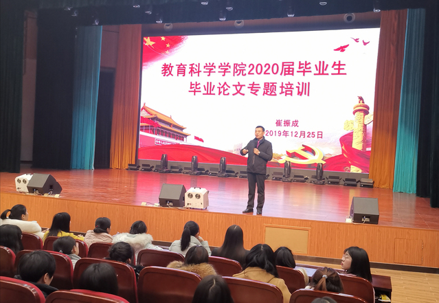 为了有效落实学院大四学生毕业论文工作,确保论文选题等相关事宜如期进行,2019年12月25日晚上,教育科学学院在多功能报告厅举办了2020届毕业论文专题培训。此次培训由崔振成老师主讲,教育科学学院毕业生辅导员和2020届全体毕业生参加了这次培训。