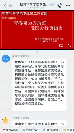 为进一步贯彻落实习近平总书记关于坚决打赢疫情防控阻击战的重要指示精神,引导学生党员的发挥锋模范作用,强化责任与担当意识,教育科学学院学生第二党支部于3月31日开展了以“青春聚力齐抗疫,爱国力行勇担当”为主题的线上党日活动。