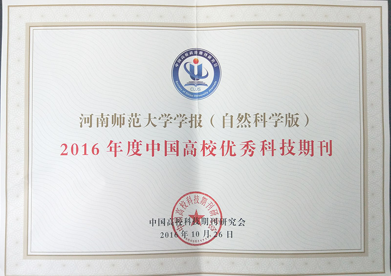 2016年11月21日至23日,中国高校科技期刊研究会第20次年会在北京会议中心举行,会议期间公布了“2016年度中国高校杰出•百佳•优秀科技期刊”和“中国高校编辑出版质量优秀科技期刊”遴选结果,我校学报自然科学版被评为“2016年度中国高校优秀科技期刊”。