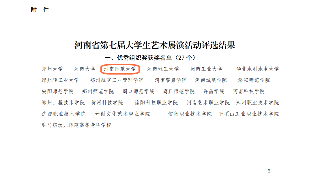 在河南省第七届大学生艺术展演活动中,获一等奖13项、二等奖12项、三等奖3项。学校荣获优秀组织奖。