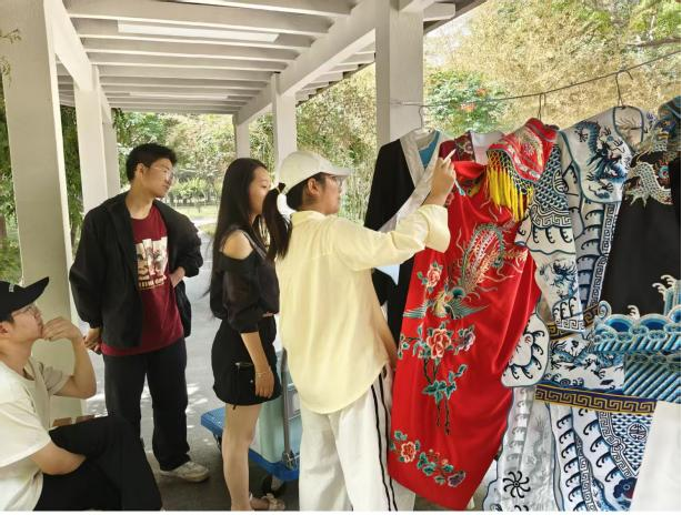 2025年5月18日上午,阳光明媚的河南师范大学西区中心花园内,陈列着一件件精美的戏曲服饰,京昆艺术研习社与河南戏曲研习社联合举办“戏曲知多少”活动,通过给同学们讲解戏曲知识并让同学们试穿戏曲服饰,展现戏曲的魅力。