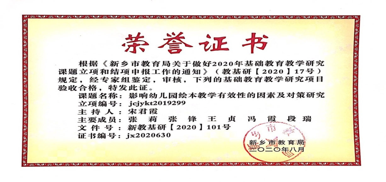 20208月,幼儿园两项新乡市基础教育教学研究课题《影响幼儿园绘本教学有效性的因素及对策研究》和《数学操作活动中幼儿学习习惯培养的实践研究》通过验收,顺利结题。