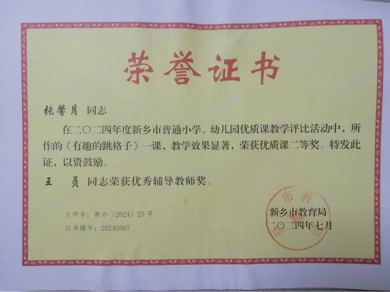 我园教师张馨月在新乡市基础教育教学优质课评比活动中所做的健康活动《好玩的垫子》一课,教学效果显著,荣获优质课评比等奖。王贞荣获优秀辅导奖。
