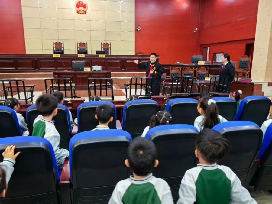 对于法院,孩子们充满期待,教师结合图片、视频,帮助孩子们了解法院,建立初步的认知。在讲解员的带领下,孩子们来到诉讼服务中心,参观大厅、办公区域,了解工作人员的工作职责。 紧接着,来到法院最具有代表性的地方——审判庭。法庭干警用通俗易懂的语言向孩子们详细介绍了法院的职能、诉讼流程以及法院的日常工作。法官身穿法袍坐在审判长的席位,庄严敲响法槌的瞬间让孩子感到无比崇拜,不时发出“哇......”的感叹声。随后,孩子们一一敲响神圣的法槌,亲身感受到身为一名法官所肩负的神圣职责:公平、正义、法治、廉洁。
