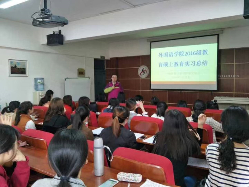 3月13日下午,外国语学院在国培教室举行了2016级教育硕士实习总结汇报及经验交流会。外国语学院中小学教师培训办公室副主任王晔老师、2016级实习生代表及2017级教育硕士全体学生共50余人参加了本次经验交流会。