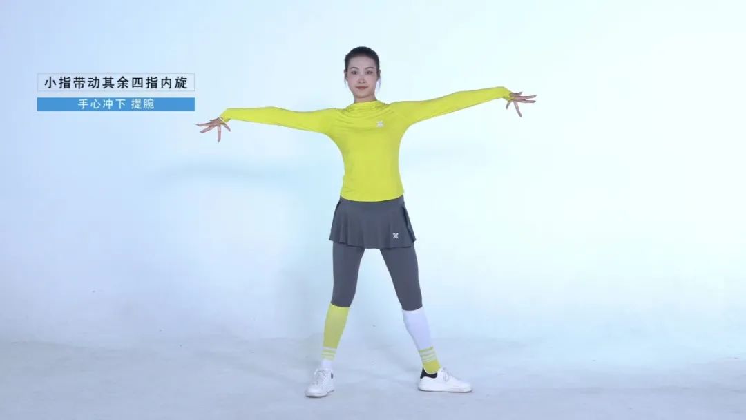 5-6拍:右脚向右侧迈一步,与肩同宽,两臂与地面平行,小指带动其余四指内旋,手心冲下,提腕形成“舞”字。
