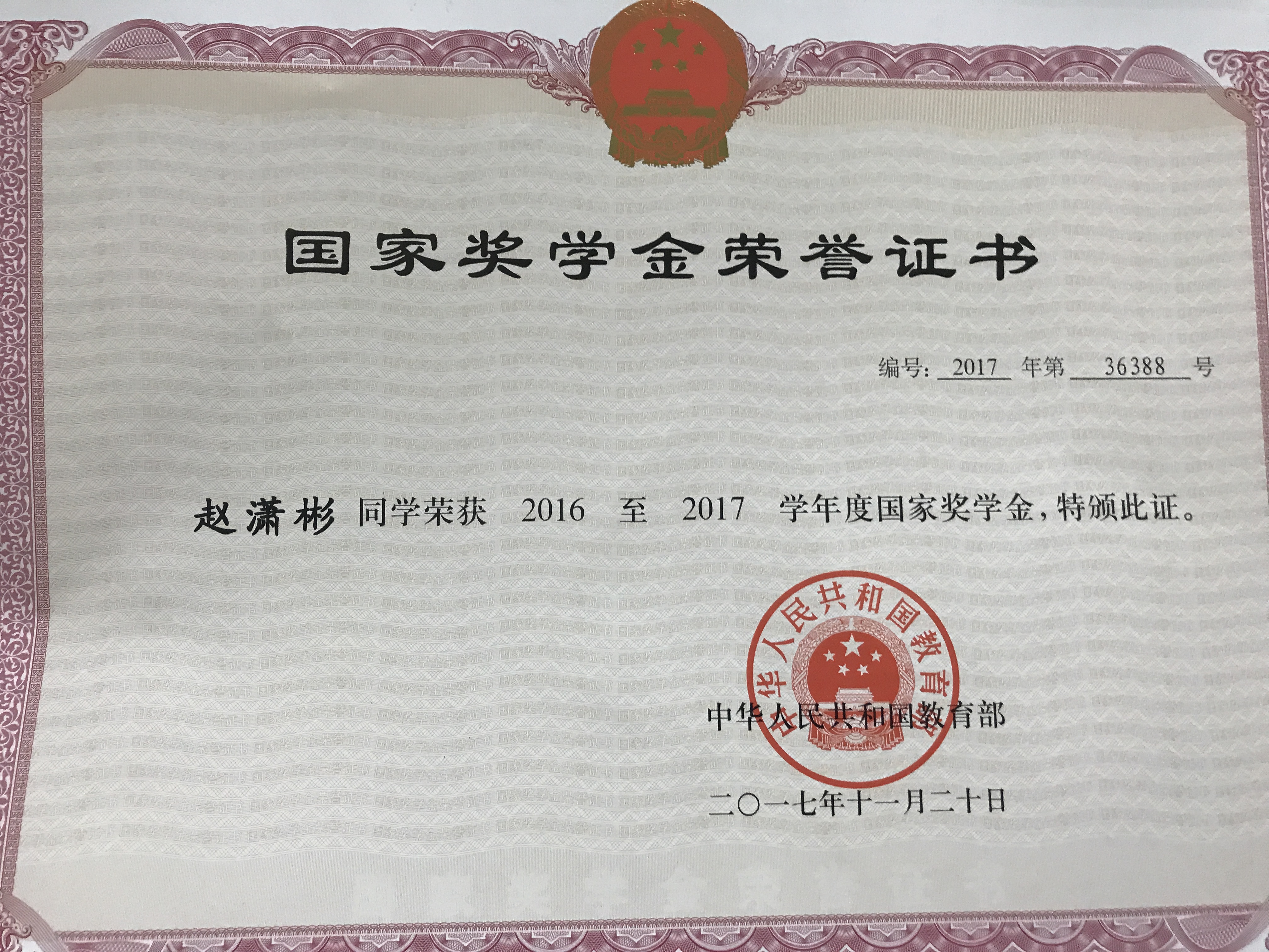 近期,由中华人民共和国教育部颁发的国家奖学金荣誉证书已下发,我院本科生李金龙、赵雅琳、赵潇彬荣获2016-2017学年度国家奖学金,三名同学在校期间成绩优异,特此表扬。