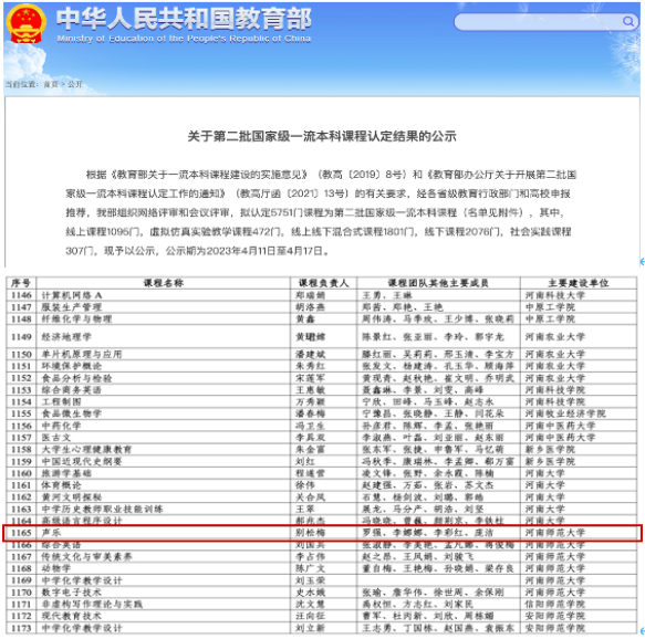 4月11日,教育部发布《关于第二批国家级一流本科课程认定结果的公示》,我院别松梅副教授牵头的《声乐》课程获批国家级线上线下混合式一流本科课程,实现了我院国家级一流本科课程历史性突破。《声乐》课程团队成员包括别松梅、罗强、李娜娜、李彩红、庞洁五位教师,此次国家级一流本科课程的获批,离不开各位老师的辛勤耕耘。