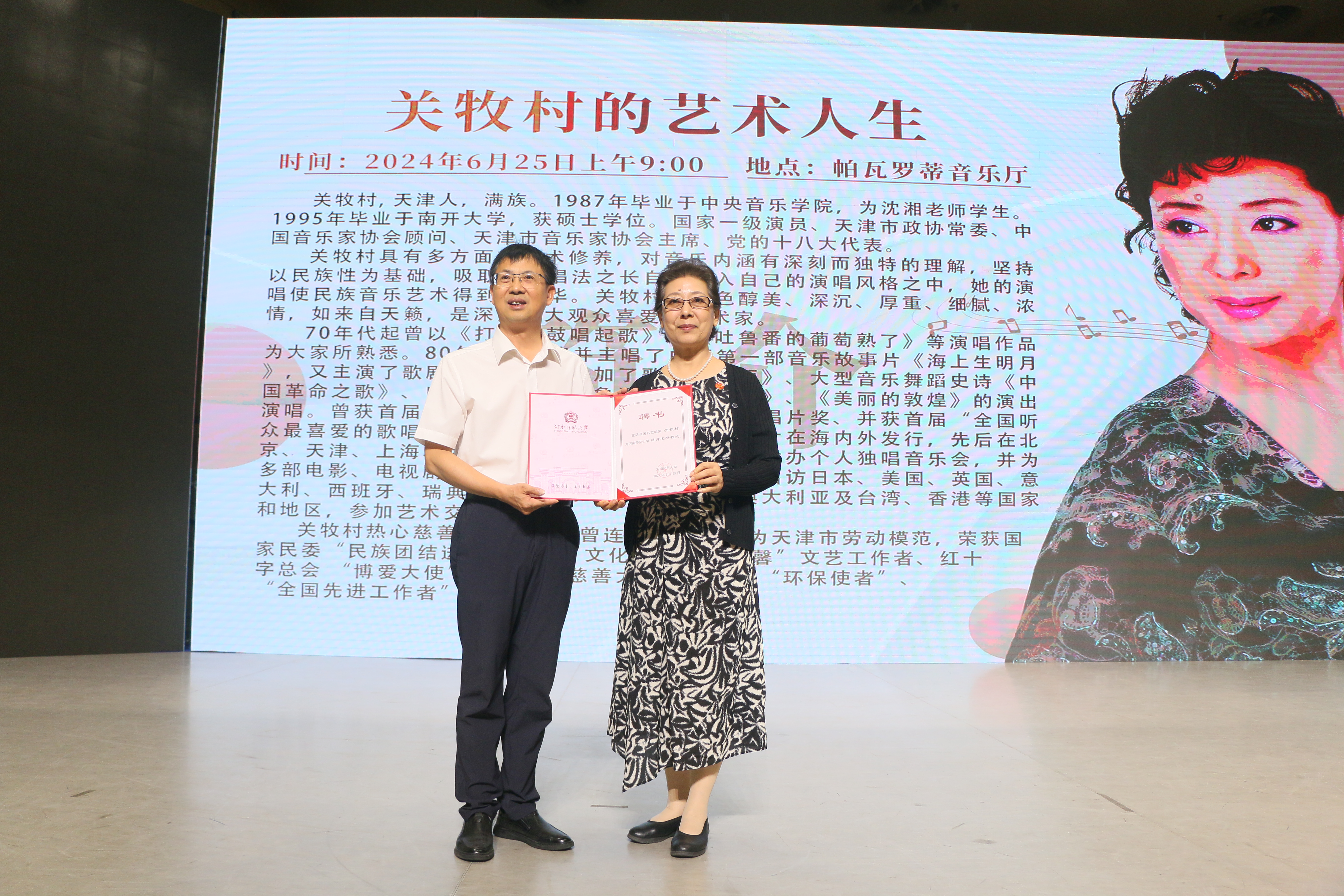 6月25日上午,著名女中音歌唱家关牧村受聘仪式在河南师范大学音乐舞蹈学院帕瓦罗蒂音乐厅举行,校党委副书记张尚字为关牧村颁发了聘书,正式聘请关牧村为河南师范大学终身名誉教授。