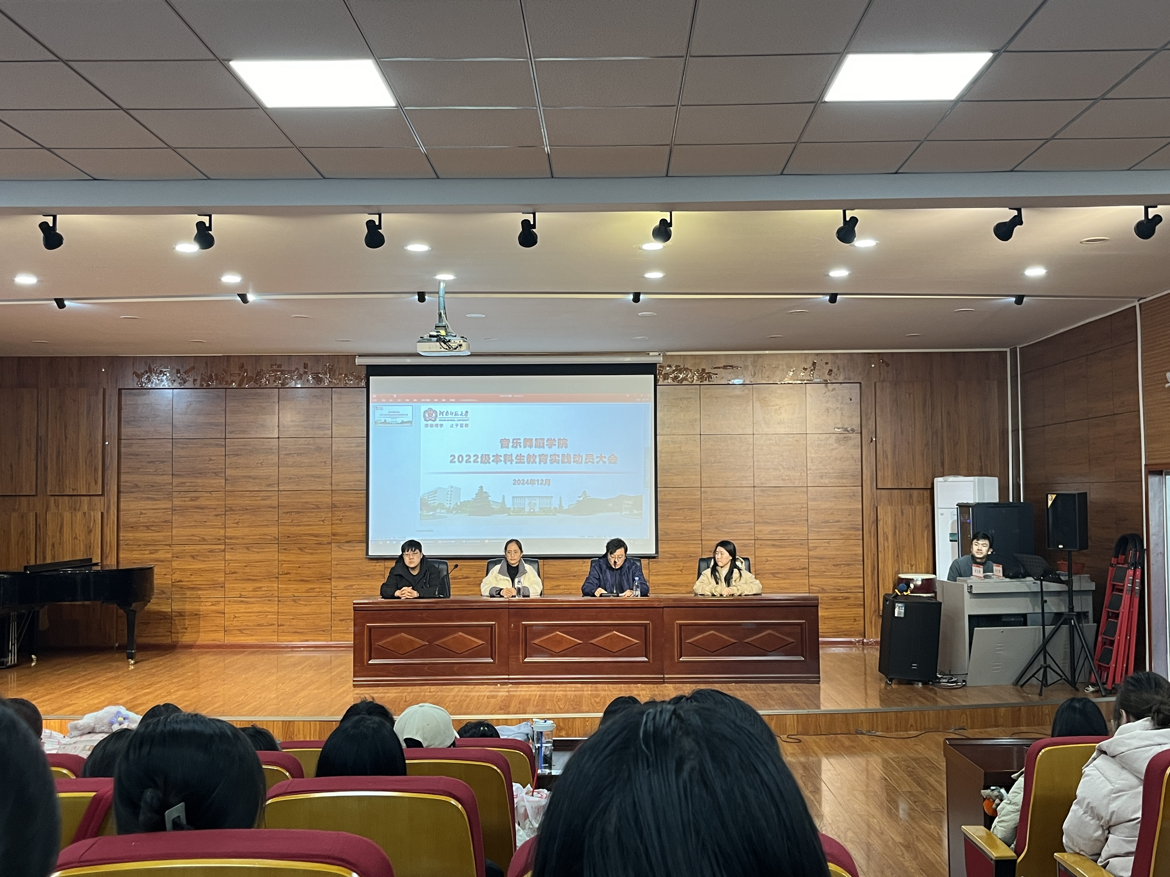 为全面贯彻教育实践理念,帮助师范生充分准备教育实践活动,12月5日中午,我院于音乐北楼501教室开展了2022级本科生教育实践动员会。学院艺术实践与实习中心副主任张寒宁、教学秘书李萌、实验班班主任梁欢及2022级音乐学专业全体学生参加会议,会议由2022级辅导员刘建丽主持。