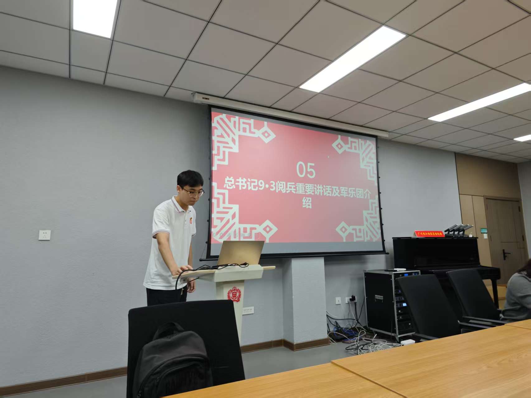 本次活动聚焦传承与弘扬伟大抗战精神,首先回顾了9月3日作为中国人民抗日战争胜利纪念日的历史渊源,深刻感悟抗战精神的内涵。随后,重点学习了习近平总书记在纪念中国人民抗日战争暨世界反法西斯战争胜利80周年大会上的重要讲话精神,结合学生专业特色,解析《在太行山上》《保卫黄河》等经典抗战歌曲的创作背景与精神内涵。