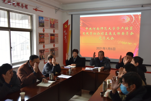 按照学校党委统一部署,报学校党委批准,资产经营有限公司直属党支部换届选举党员大会于 1月5日下午在公司党建活动室召开。资产经营有限公司党政领导和全体党员参加会议,大会由公司总经理杨海山主持。
