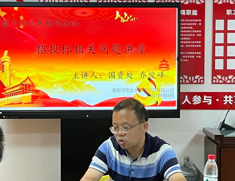 8月5日下午,资产经营有限公司“能力作风建设年”系列培训之招投标相关问题讲座在原学术交流中心会议室召开,资产公司总经理孟超、党总支部书记张新文、副总经理宋树伟,国资处副处长乔俊峰,公司各科室主任参加了会议。