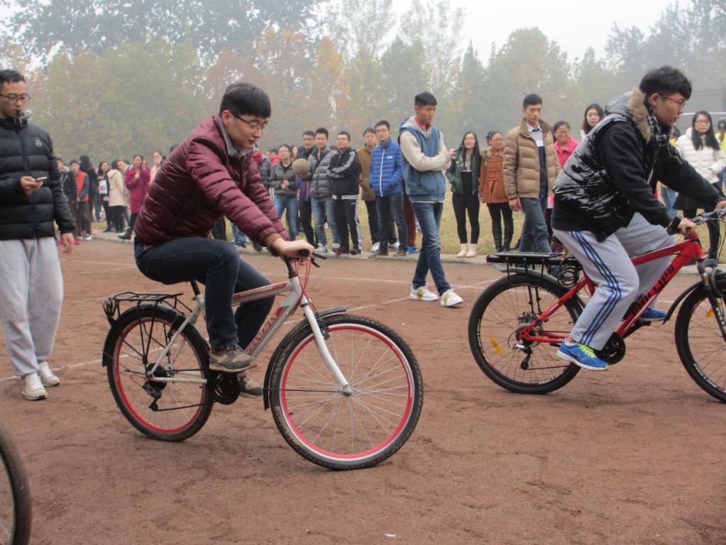 11月14日上午,由校团委主办,校研究生会承办的河南师范大学第二届研究生趣味运动赛在西校区塑胶操场如期展开,共有全校16个学院的研究生参加了比赛。本次趣味运动会主要分四个环节,慢骑自行车、穿越呼啦圈、筷子接龙和脚夹气球接力赛。为了避免出现最后总成绩相等的情况,比赛还设置了加时赛——趣味小火车。