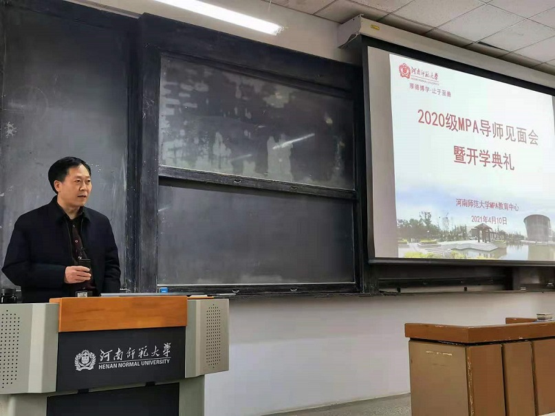 2021年4月10日上午8:30,河南师范大学MPA教育中心在文渊楼121教室举行2020级MPA导师见面会暨2020级MPA研究生开学典礼(补)。MPA教育中心主任、政治与公共管理学院院长李洪河教授、MPA导师及2020级MPA研究生参加导师见面会。