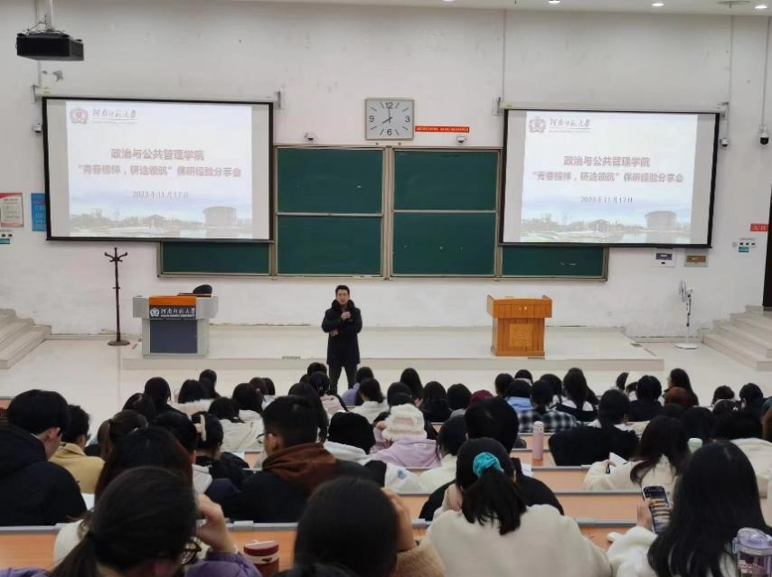 为加强学院学风建设,帮助学生明确未来规划,增进对保研相关政策的了解,我院于11月17日晚在文昌楼102教室举办“青春榜样,研途领航”保研经验分享会,四位2020级保研学生及200余名同学参加,本次会议由2020级辅导员王鸿飞主持。