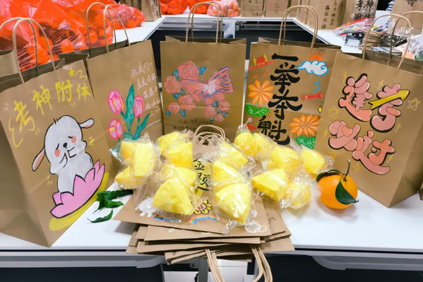 活动中,学院领导班子成员亲手将装满心意的慰问礼包送到学子们手中,与大家亲切交流,为大家鼓劲打气。据悉,此次发放的慰问礼包暗藏巧思、饱含深情。礼包袋均由低年级学生手绘创作,每一笔色彩都承载对学长学姐的真挚期许,每一个图案都凝聚跨年级的温情祝福,每一件独一无二却暖意相通。礼包内的物品更是寓意深远:印着专属姓名的“百事可乐”,寄托“万事顺遂”的美好祝愿;饱满诱人的柿子象征“事事如意”,酸甜多汁的橙子寓意“心想事成”;软萌解压的“拿捏芝士”捏捏乐为紧绷备考时光增添趣味,提神醒脑的能量糖果助力驱散疲惫,每一份物品都饱含学院对学子的细致关怀。