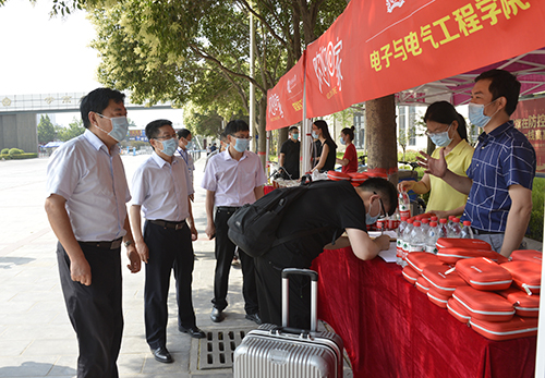 陈广文、马治军、张尚字一行先后来到报到的各个流程点视察指导工作,就返校报到过程中的重点环节、风险点和防控点提出了指导意见,并热情欢迎同学们“回家”,亲切询问报到学生从哪里返校,如何返校,返校路途如何注意个人防护等情况,还非常关心地询问学生的升学、就业情况。校领导在东、西校区详细询问了各项工作流程,对坚守在岗位的工作人员表示慰问,要求各部门要严格落实返学复学各项工作要求,扎实做好防控细节,筑牢校园安全防线,确保学生返校报到安全有序。