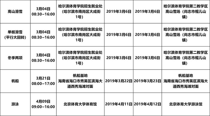 从去年开始,体育专项考试分项目采用全国统考和分区统考方式。冬季项目考试时间2019年2月1日至3月15日;其他项目考试时间2019年4月1日至5月10日。冬季项目考试时间比去年提前,且明显延长。