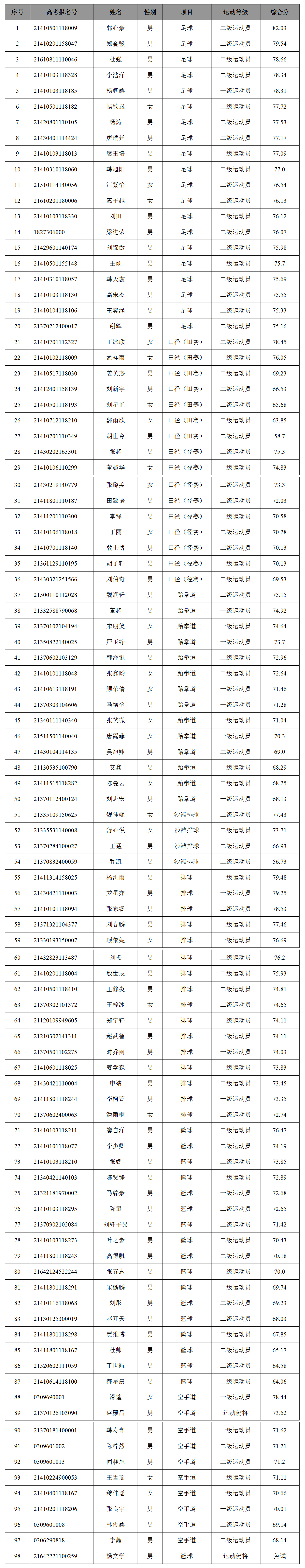 为贯彻运动训练专业招生考试公正、公平、公开的原则,根据国家体育总局办公厅、教育部办公厅《关于印发<2021年普通高等学校运动训练、武术与民族传统体育专业招生管理办法>的通知》(体科字[2020]169号)要求,现将我校2021年运动训练专业单独招生录取原则及拟录取考生名单公示如下: