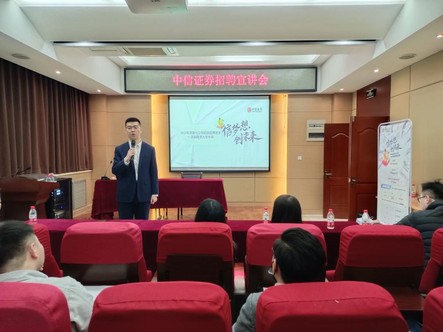 中信证券股份有限公司是中国证监会核准的第一批综合类证券公司之一,是中国第一家A+H股上市的证券公司,业务范围涵盖证券、基金、期货、直接投资等多个领域,在金融行业中保持领先地位。宣讲会上,中信证券公司新乡营业部执行总经理雷永鹏为学生播放企业宣传片,就公司经营模式及理念、招聘岗位、福利待遇等进行讲解,让学生对企业有更直观地了解。此外,中信证券公司从业人员李雪分享自己的工作经历,介绍公司良好的薪酬待遇、优质的工作团队、完善的福利保障等。在问题交流环节,公司负责人耐心回答学生提出的有关简历投递、招聘要求等问题,打消应聘学生疑虑,有效扩宽校企合作间的信息桥梁,现场氛围十分活跃。宣讲结束后,商学院党委副书记马淑明对宣讲内容进行总结,鼓励学生踊跃参加相关招聘活动,为人生发展挖掘机遇,创造有利条件。团委书记王岩肯定了宣讲会对毕业生就业及企业招新的积极作用,对学生提出殷切期待。