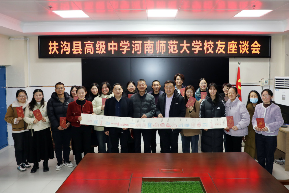 发放仪式后,董长雨、李文胜与河南师范大学在扶沟县高级中学工作毕业生进行了座谈交流,扶沟高级中学目前400余名教职员工中有107位曾毕业于河南师范大学,这些校友代表在座谈会上不但各自回顾了曾在师大的学习生活,而且对师大办学百年表示祝贺,并为师大的发展建言献策。座谈会上,董长雨、李文胜为校友发放了师大百年校庆文创产品,同时鼓励大家要把师大优良的学风和教风传承传扬下去,努力在基层岗位上真扎实干、建功立业,同时也要经常回“家”看看。在报告厅,材料科学与工程学院副教授翟海法以《相遇、相识、相知》为题为学生进行了材料方面的专业科普讲座,青年教师姜璐璐博士作为扶沟县高级中学2009届毕业生为学生分享了其高中及以后的求学经历,鼓励勉励大家树立远大目标,勇于求知进取。他们与学生进行了积极活跃交流互动,并对学生的当前学习、未来发展提出了意见建议。