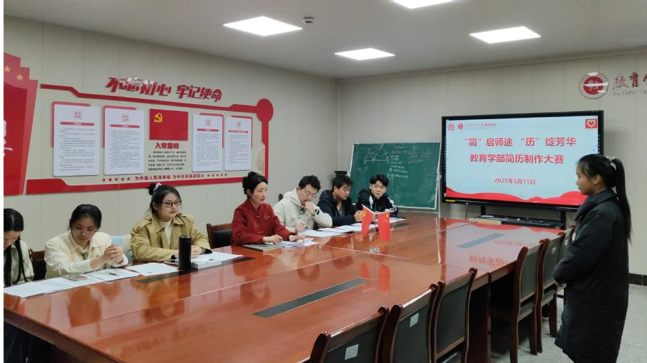 为帮助学生提高简历设计水平,制作出与目标岗位契合度更高的简历,3月11日,教育学部在田家炳807会议室举办主题为“简”启师途、“历”绽芳华的简历制作大赛。学部专兼职辅导员担任评委,毕业班学生参加比赛。