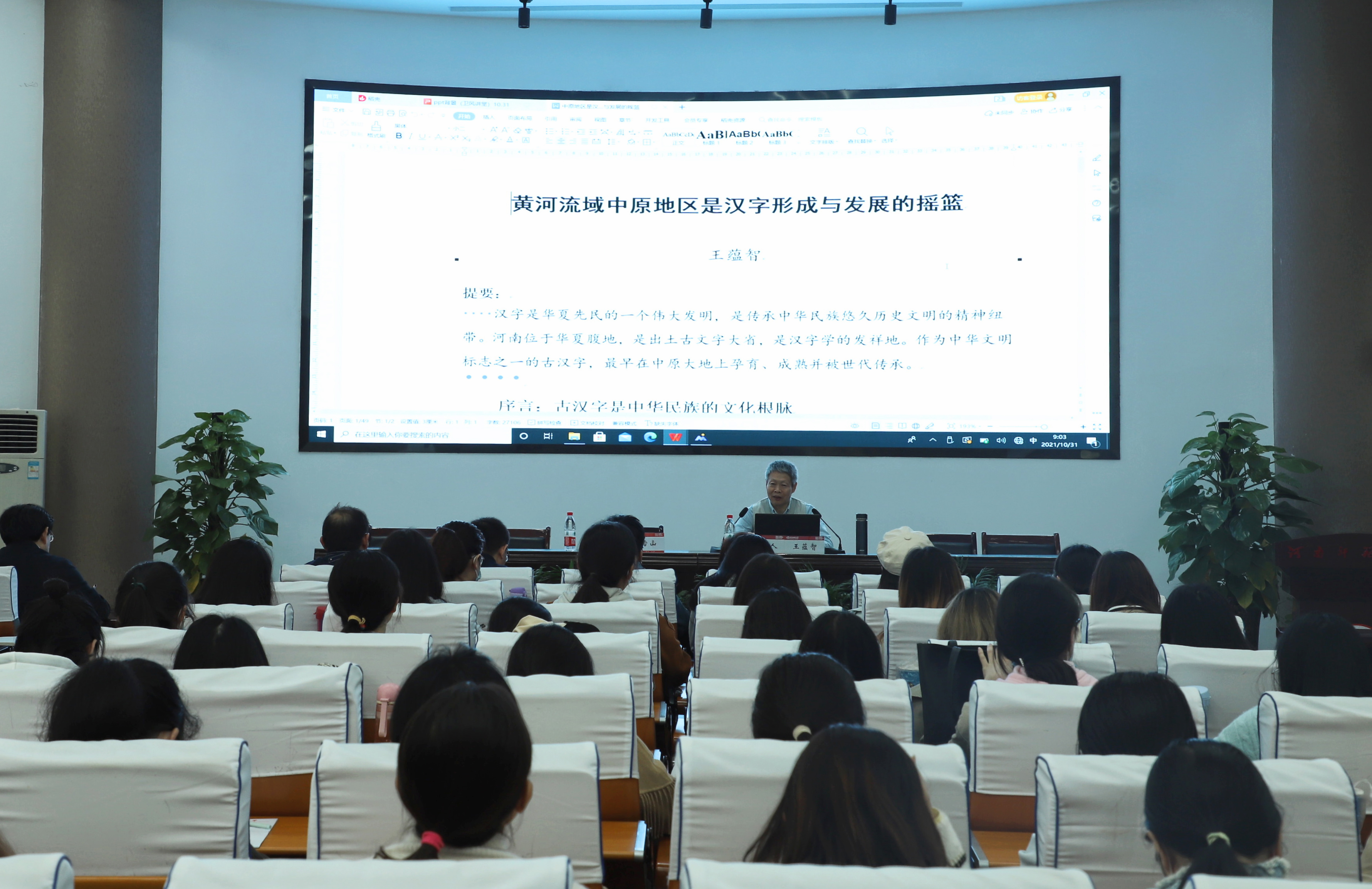 10月31日上午,河南大学王蕴智教授应邀在文学院一楼报告厅为我院师生作题为“中原地区是汉字早期形成与发展的摇篮”的讲座。讲座由我校党委常委、副校长李雪山主持,近百名师生参与学习。