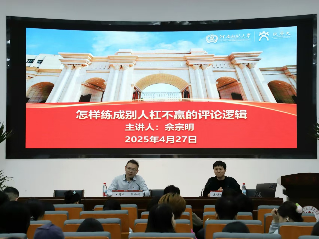 4月27日晚,知名新闻评论员佘宗明应邀做客“卫风讲堂”,在崇文楼一楼报告厅为学院师生作题为“怎样练成别人杠不赢的逻辑”的学术讲座。讲座由文学院副院长屈会超主持,学院百余名学生参与。
