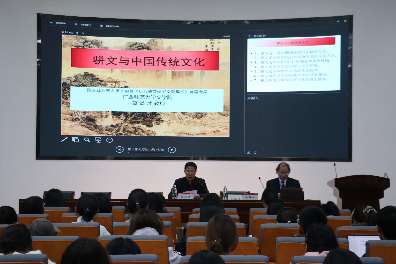 1018日下午,广西师范大学莫道才教授应邀做客“卫风讲堂”,在崇文楼一楼报告厅为学院师生作题为“骈文与中国传统文化”的学术讲座。讲座由文学院学术委员会主任周相录教授主持,学院师生积极参与学习。